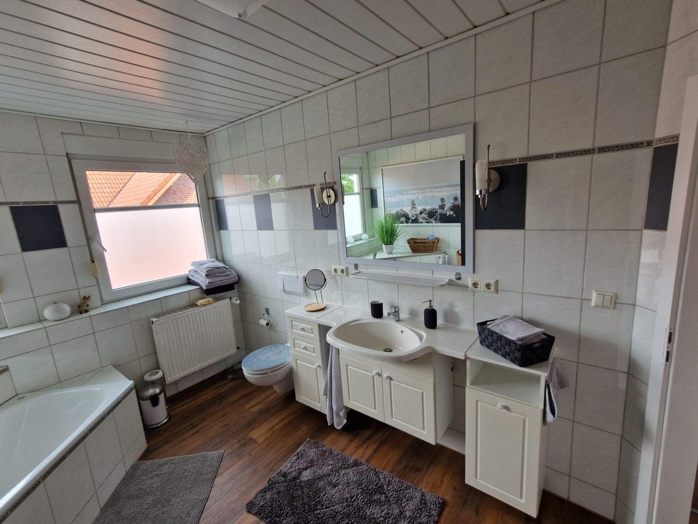 Geräumiges Badezimmer mit Badewanne, Dusche, Waschmaschine und Trockner